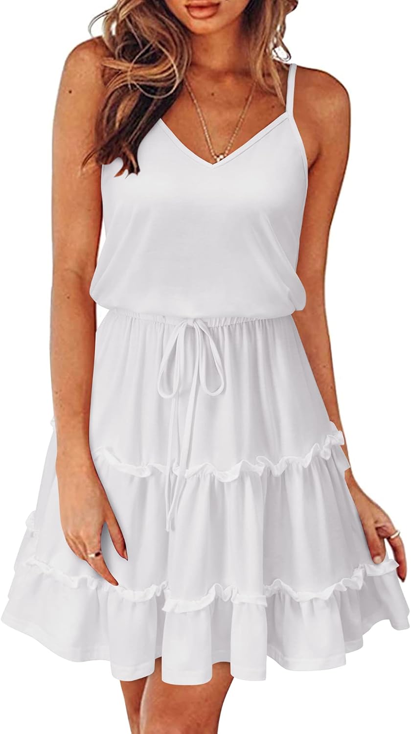 Newshows Sommerkleid Damen Knielang Spaghettiträger Kleid V-Ausschnitt Strandkleider M Weiss, M Wei&
