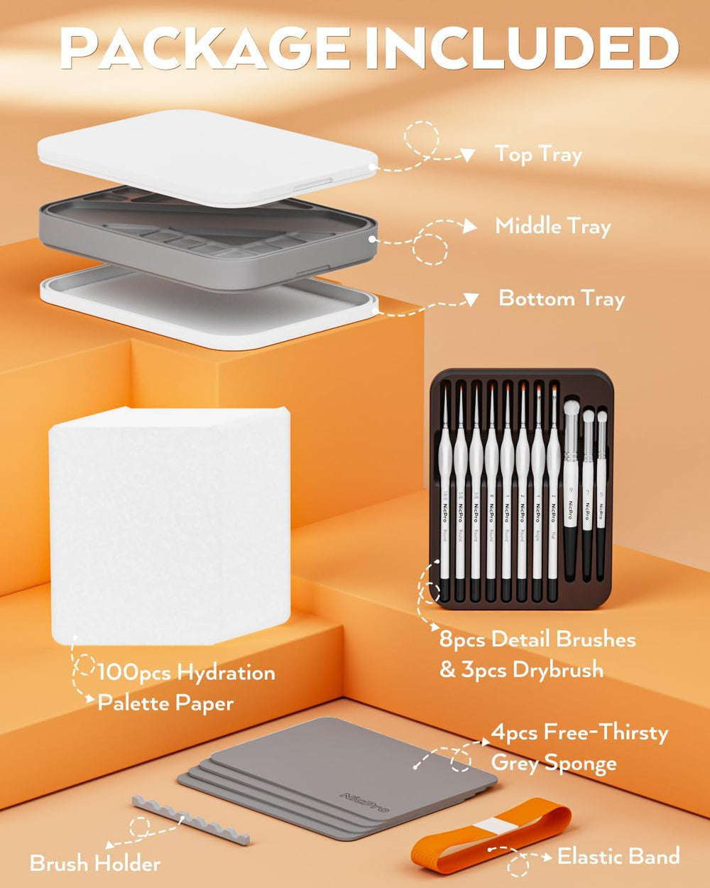 Nicpro Mischpalette mit Wet Palette und 11 Feine Pinsel, Dry Brush, 100 Nasspalettenpapier, 4 Schwäm