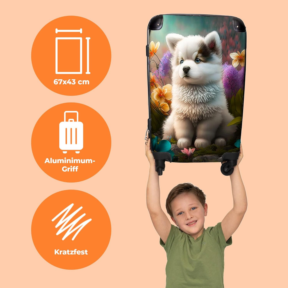 Koffer gross Trolley Rollkoffer Reisekoffer mit 4 Rollen Fotokoffer - Welpe - Blumen - Pflanzen - Na