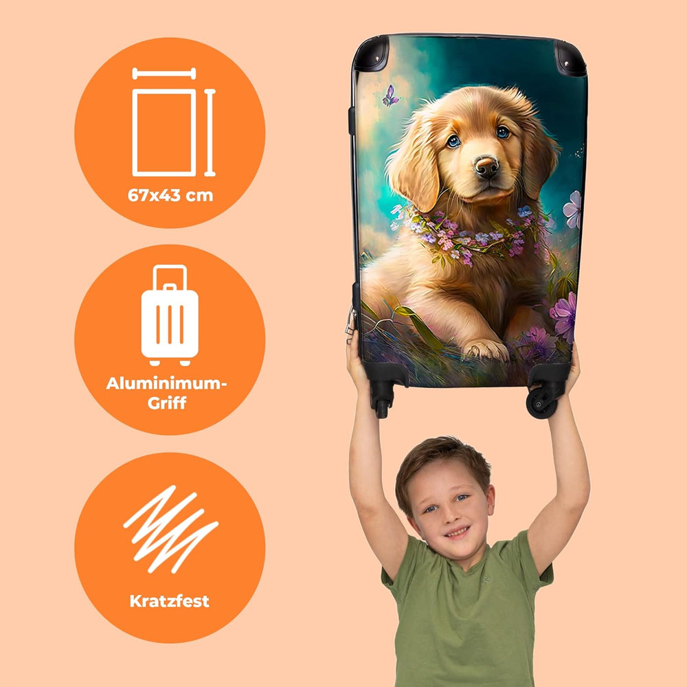 Koffer gross Trolley Rollkoffer Reisekoffer mit 4 Rollen Fotokoffer - Welpe - Blumenkranz - Schmette