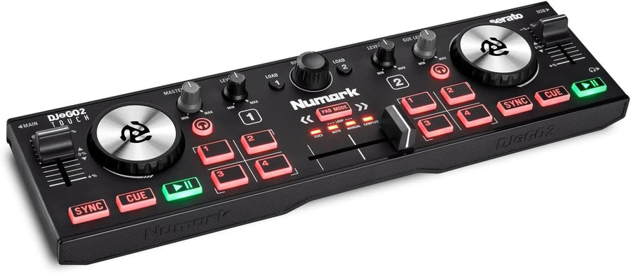 Numark DJ2GO2 Touch – Mini DJ Controller für unterwegs - 2-Deck USB DJ Pult mit Audio Interface und