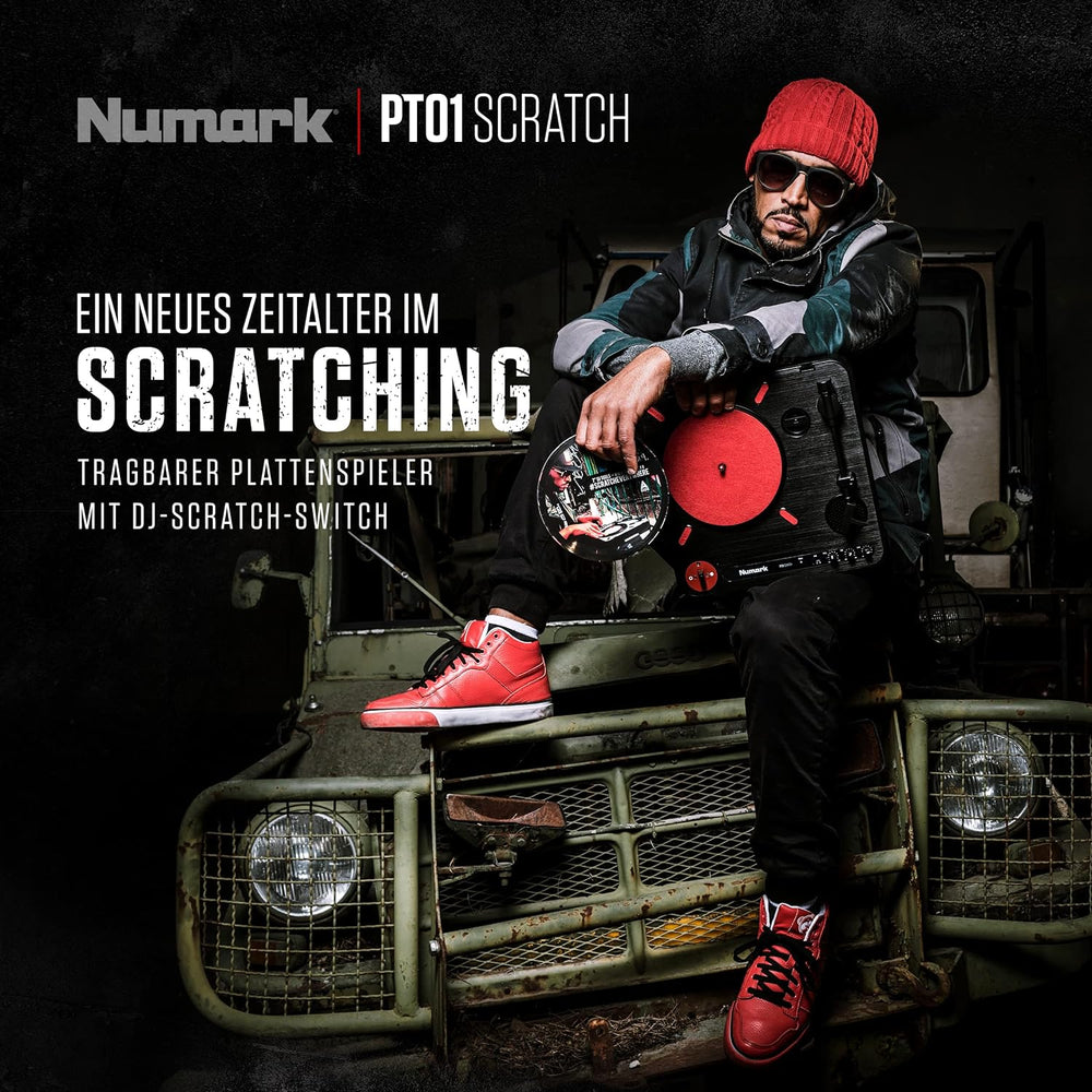Numark PT01 Scratch - tragbarer DJ-Plattenspieler mit auswechselbarem Scratch-Switch, eingebautem La