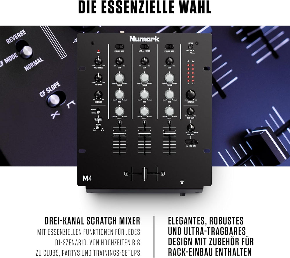 Numark M4 - 3-Kanal Scratch DJ Mixer, Rack-montierbar mit 3-Band EQ, Mikrofoneingang und austauschba