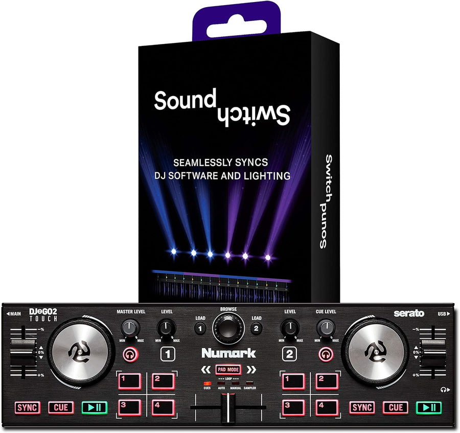 Numark DJ2GO2 Touch + SoundSwitch Micro DMX Interface - 2-Deck USB DJ-Controller für Serato DJ mit M