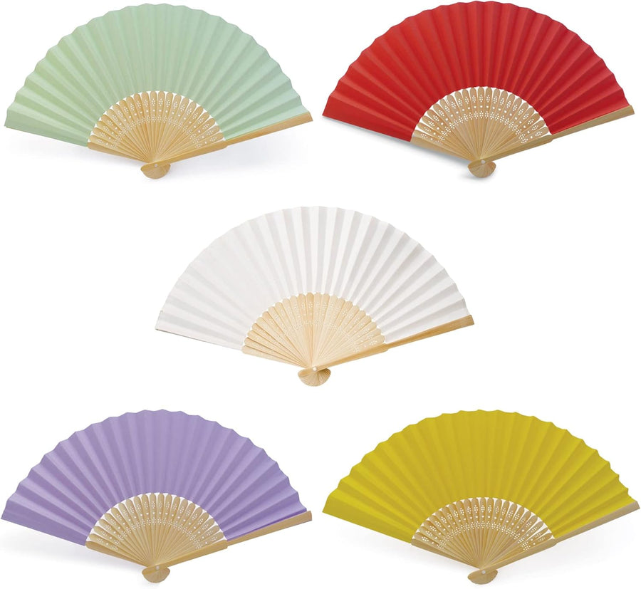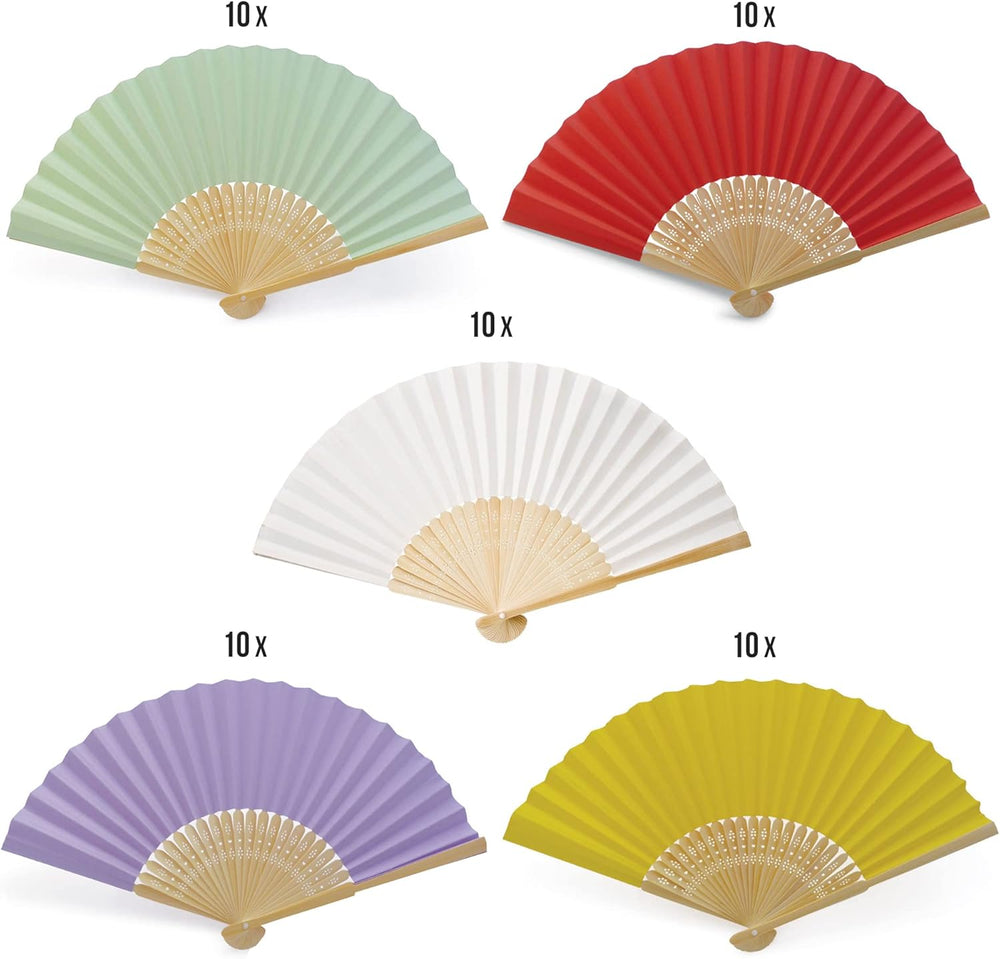 OLILLY - 50 bunte Fächer aus Papier und Bambus für Gäste – Weiss, Grün, Rot, Lavendel und Gelb – Hoc