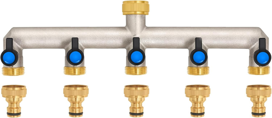 5-Wege Wasserhahn Wasserverteiler aus Messing für 5 Geräte/Gartenschläuche, 5er Verteiler 3/4" Adapt