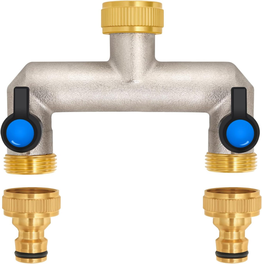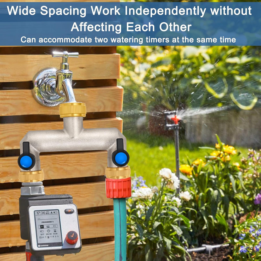 2-Wege Wasserhahn Wasserverteiler aus Messing für 2 Geräte/Gartenschläuche, 2er Verteiler 3/4" Adapt