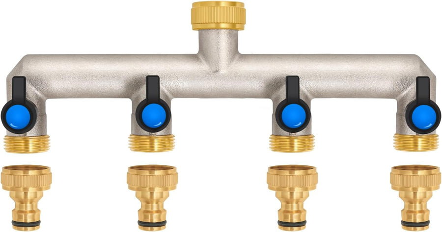 4-Wege Wasserhahn Wasserverteiler aus Messing für 4 Geräte/Gartenschläuche, 4er Verteiler 3/4" Adapt