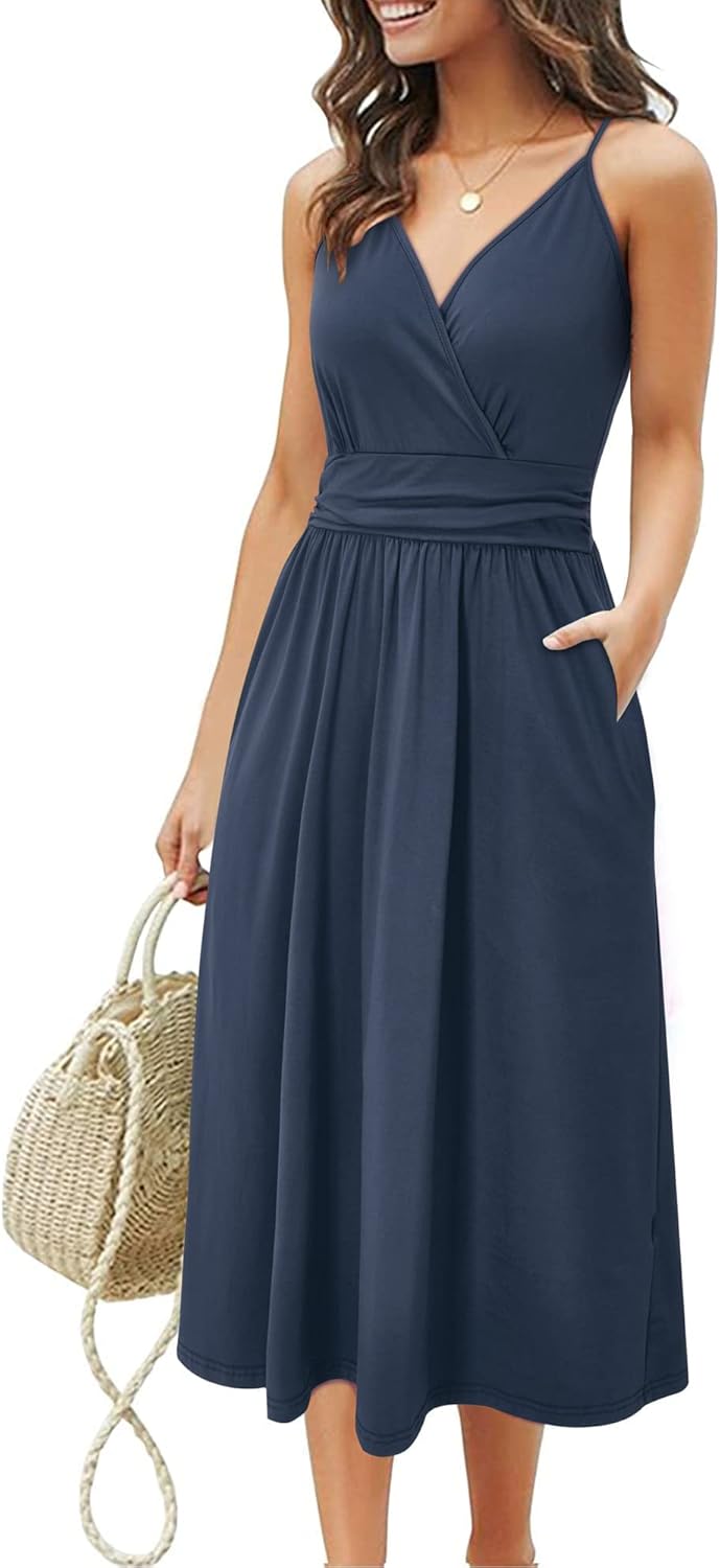OUGES Kleid Damen Spaghettiträger Sommer Kleider Knielang V-Ausschnitt Strandkleid mit Taschen S Flo
