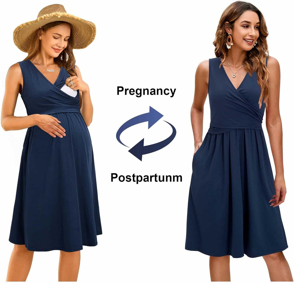 OUGES Damen Sommer Umstandskleid Stillkleid Baumwolle Schwangere Lässiges Frühling Kleider mit Tasch