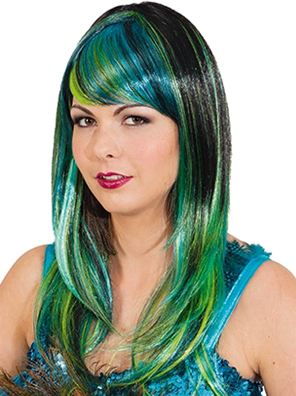 Faschingsperücke Damen Pfauen Lady, schwarz-blau-grün