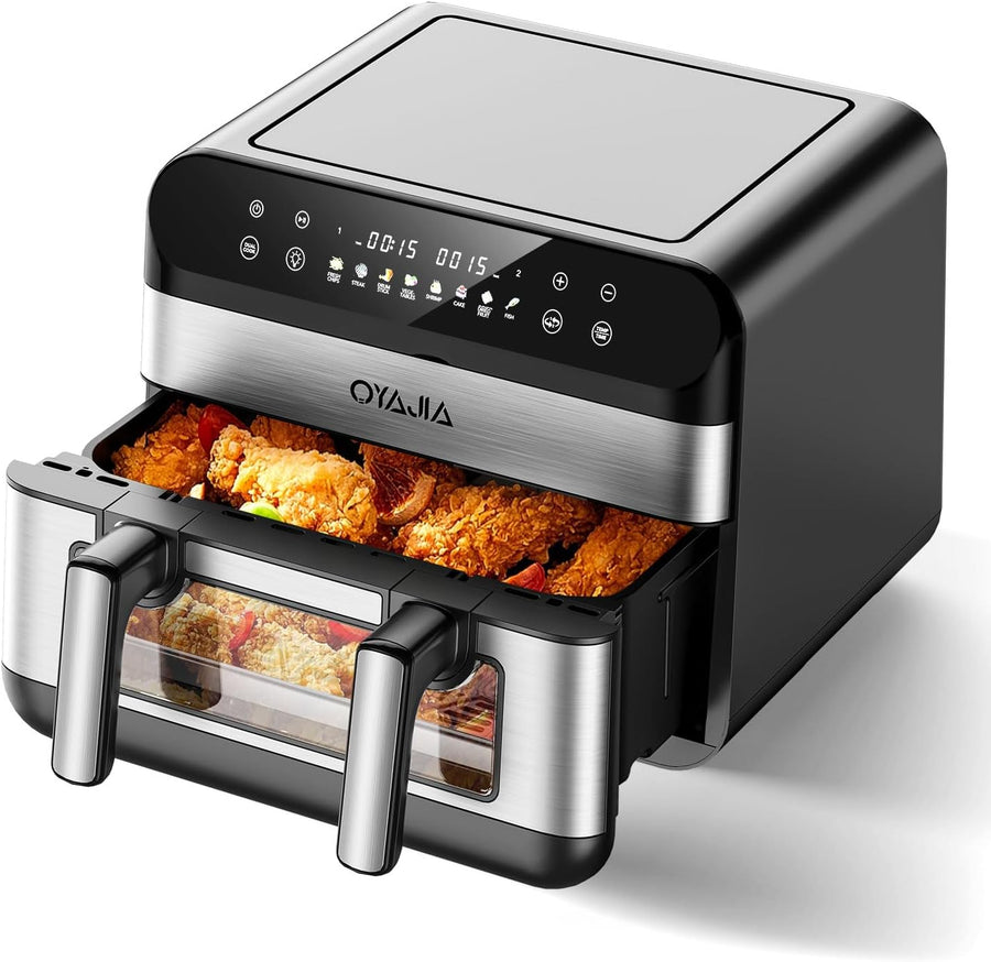 Dual Zone Heissluftfritteuse mit Sichtfenster, 9L XL Kapazität Doppel-Airfryer, 2 Schubladen, 8-in-1