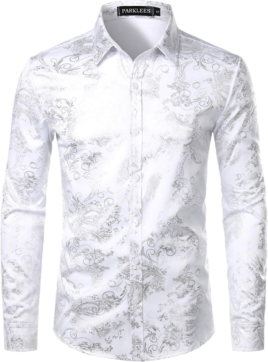 PARKLEES Herren Casual Luxus Bedrucktes Seide wie Satin Button Down Kleid Hemd für Party Hochzeit XX