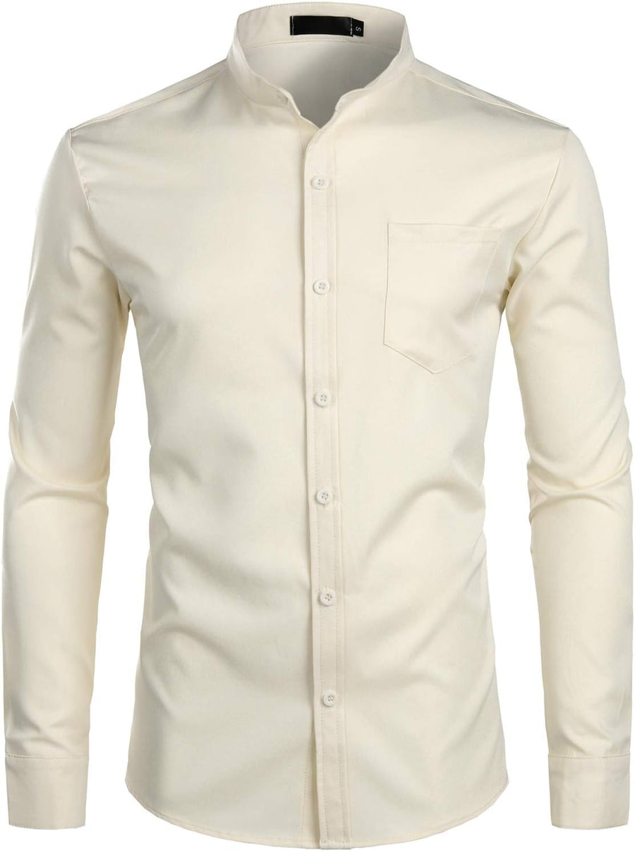 PARKLEES Herren Grandad-Kragen Slim Fit Langarm Casual Button Down Kleid Shirts mit Tasche M Beige,