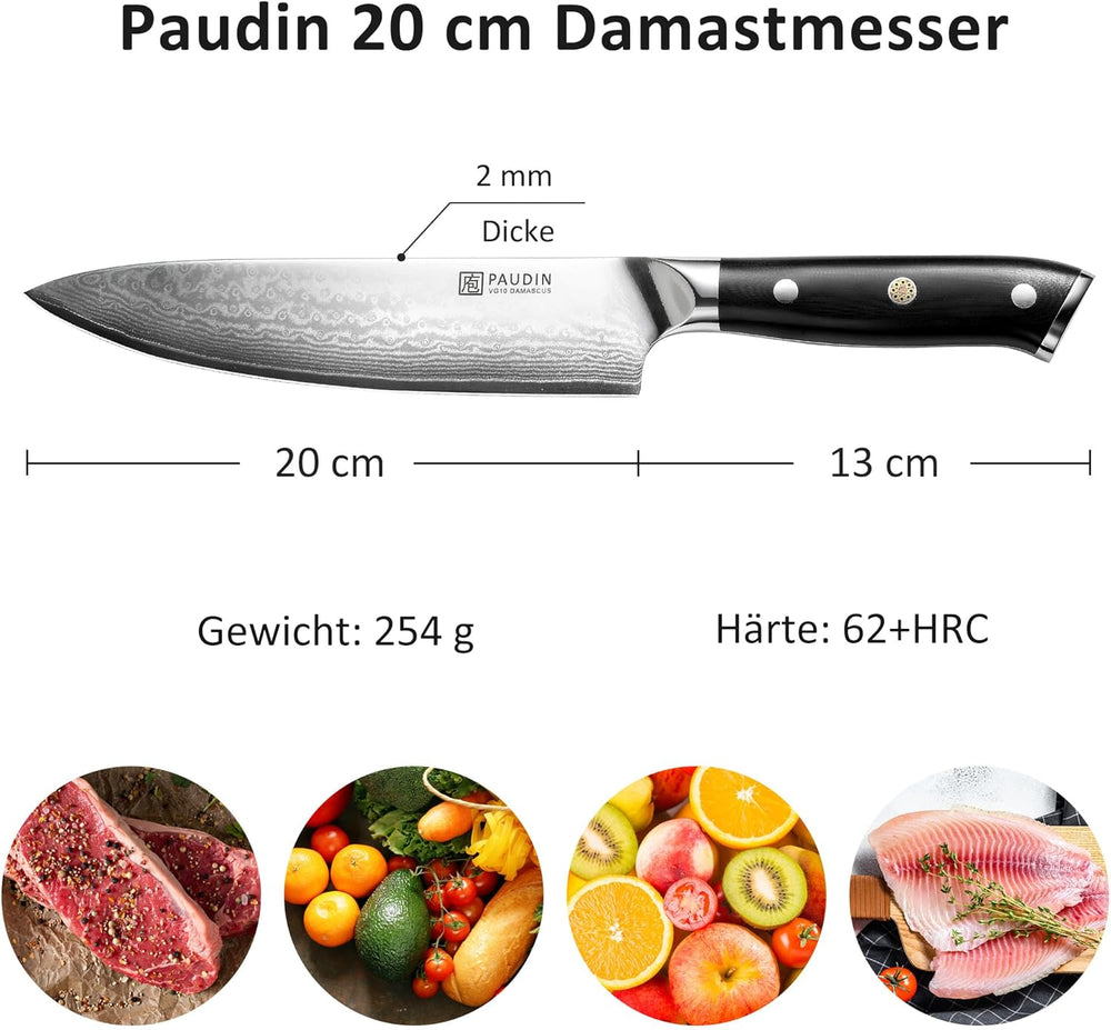 PAUDIN Damastmesser Kochmesser Küchenmesser 20 cm Damaststahl Messer mit Ergonomischem G10-Griff Dam