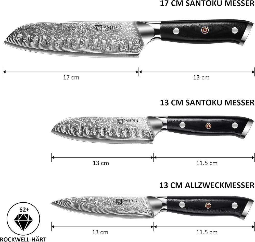 PAUDIN Damastmesser set, Messerset 3-teilig, Damast Küchenmesserset mit Ultra Scharfes Santokumesser
