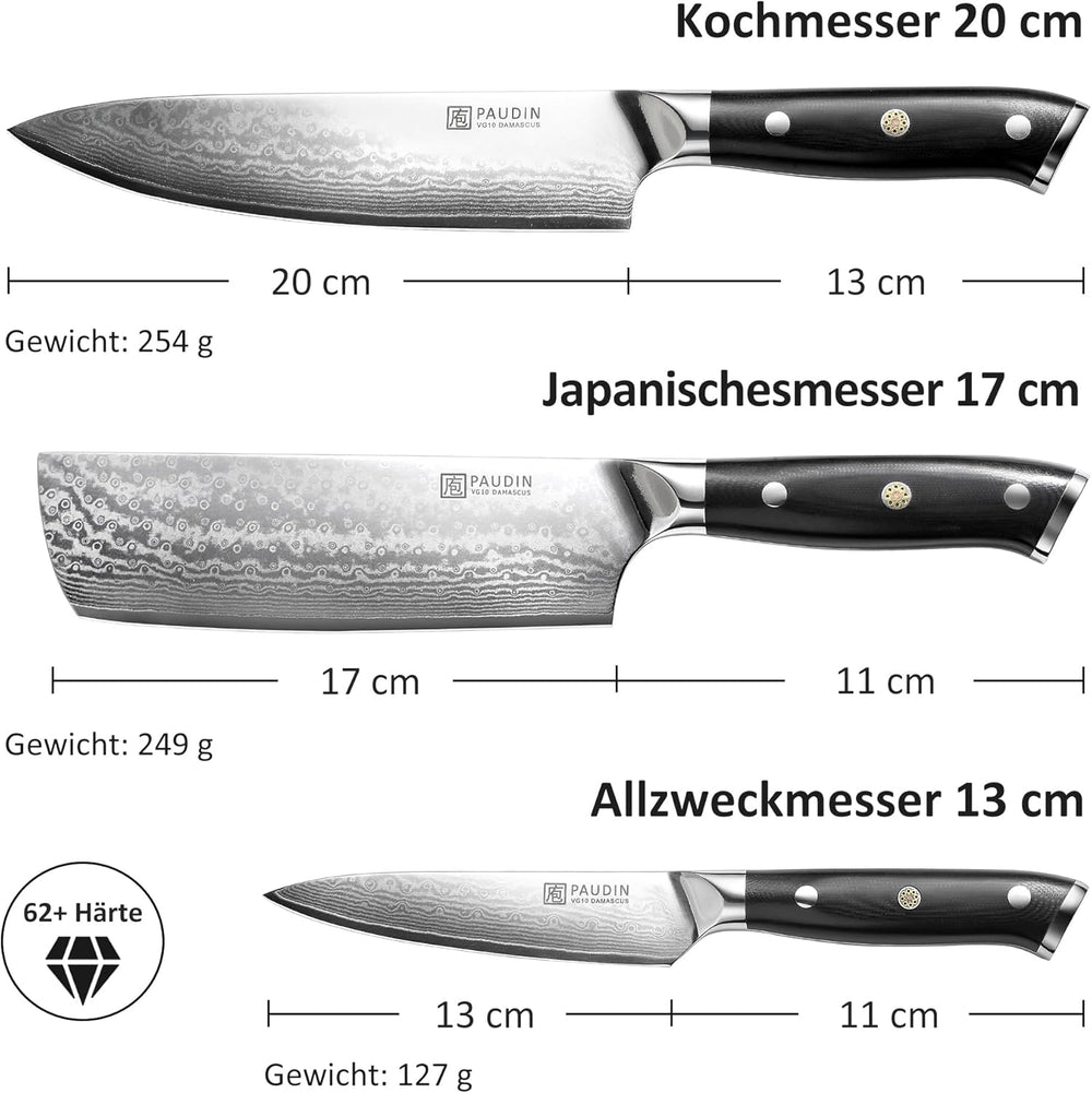 PAUDIN 3-tlg Küchenmesser Set, Damastmesser Set aus 67 Schichten VG10 Damaststahl mit G10 Griff – Ch