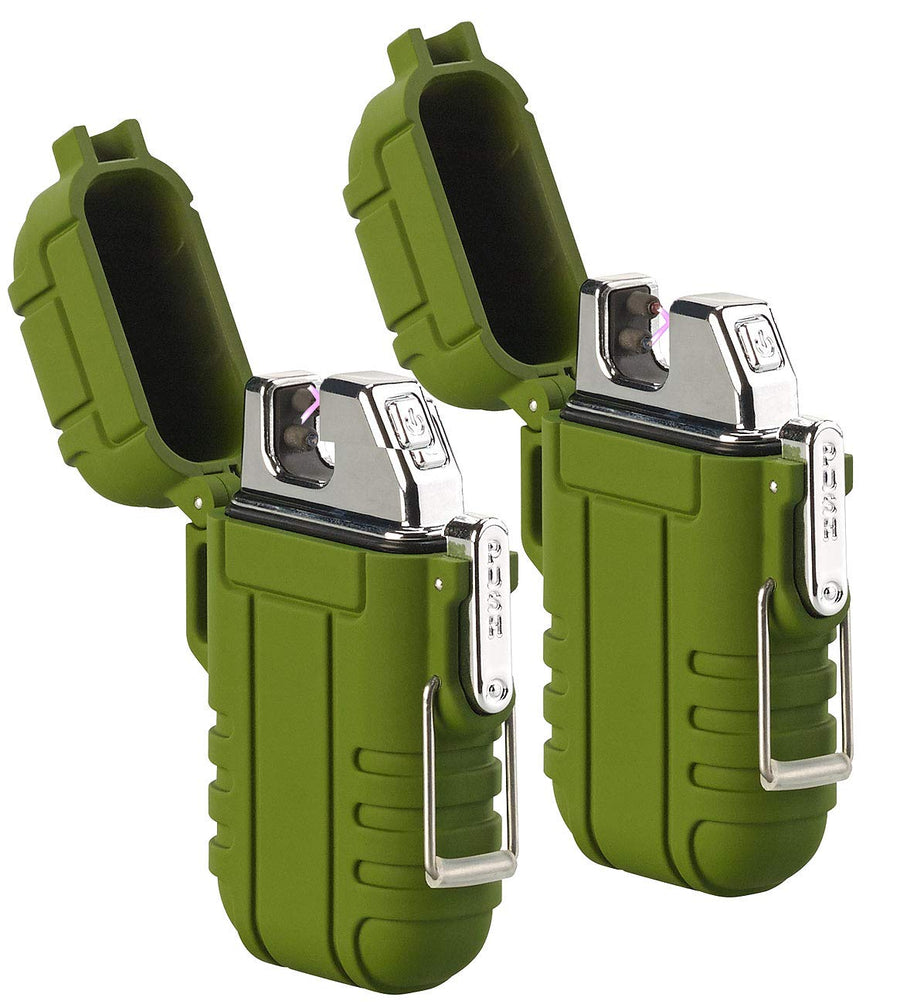 PEARL Akku-Feuerzeug: 2er-Set Elektronisches Feuerzeug mit doppeltem Lichtbogen, IP56, Oliv (Akku-US