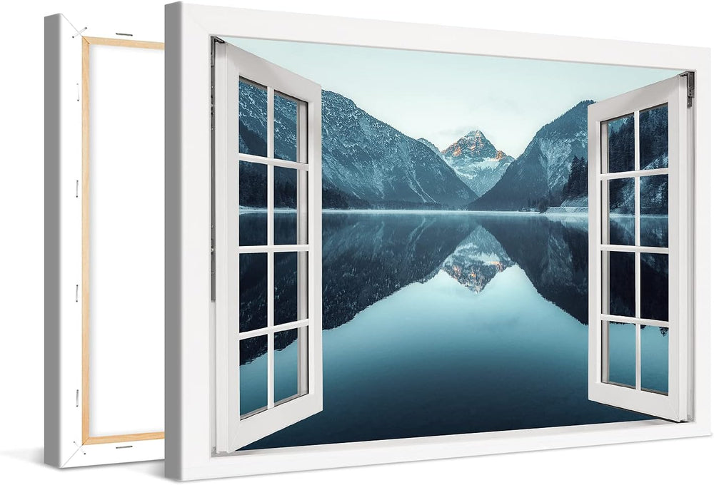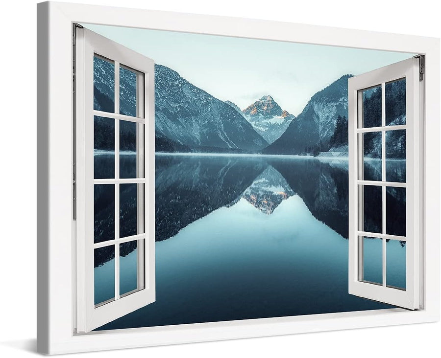 PICANOVA – Bild auf Leinwand Bergsee Plansee Fenster 120x80cm Leinwandbild – Premium Leinwanddruck –