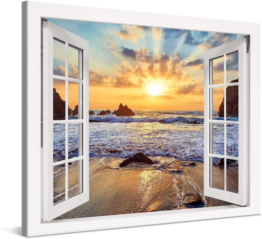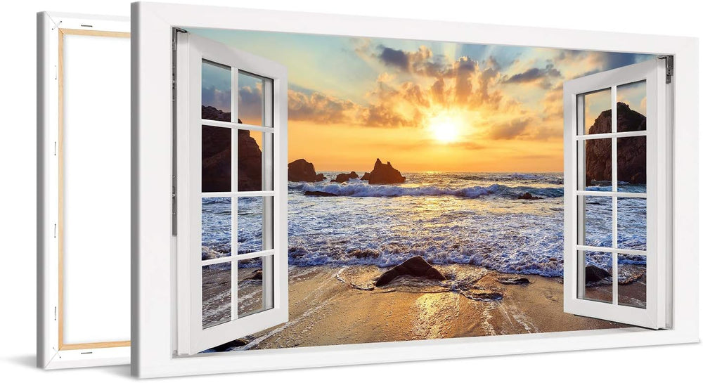 PICANOVA – Bild auf Leinwand Felsiger Strand Sonnenuntergang Fenster 80x60cm – Leinwandbild – Premiu