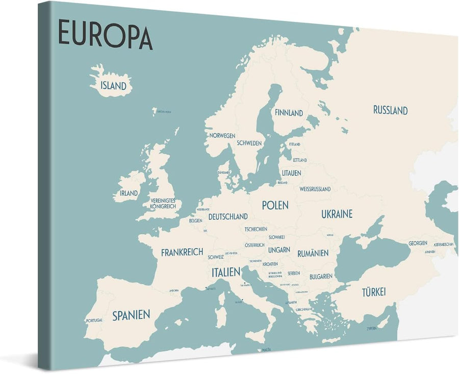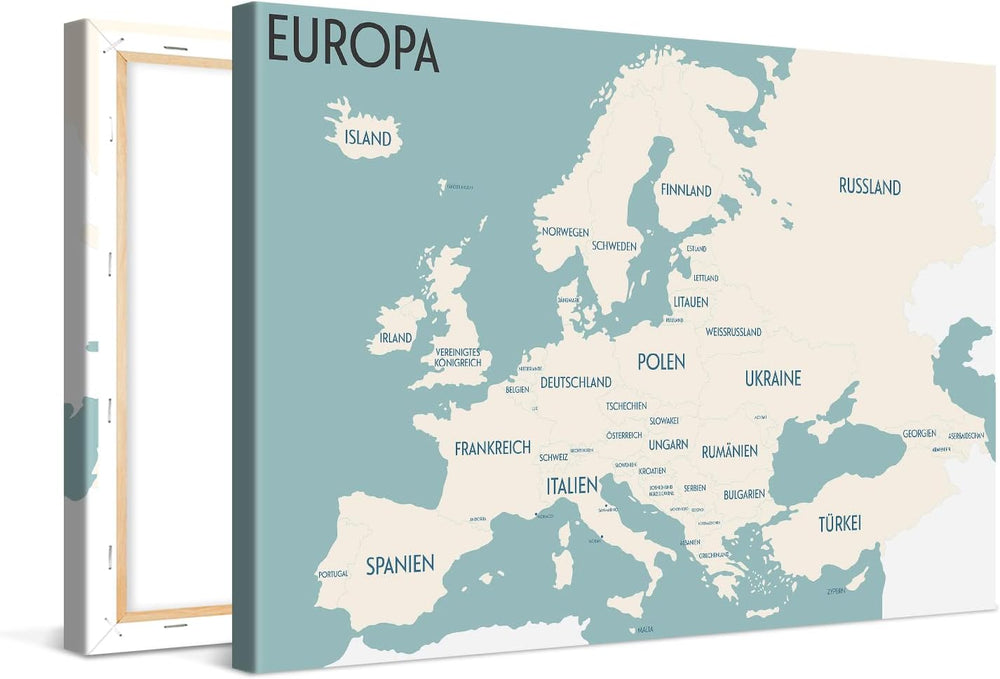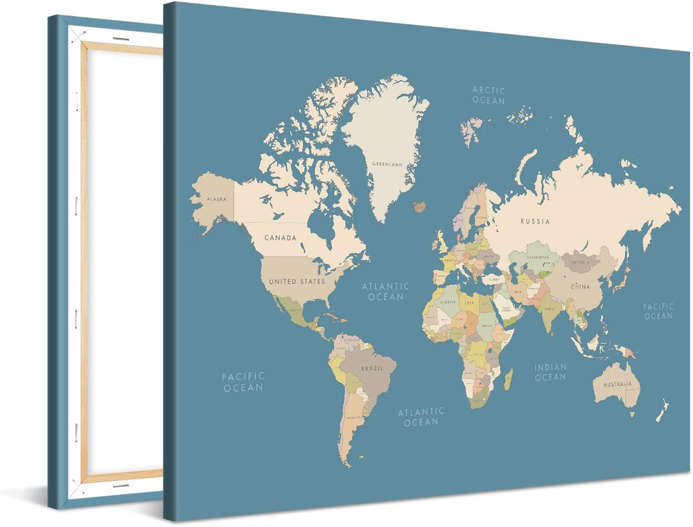 PICANOVA Weltkarte Modern Blau 90x60cm - Premium-Leinwand-Kunstdruck - Leinwand-Druck-Wand-Kunst-Dek