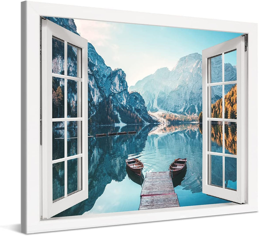 PICANOVA – Bild auf Leinwand Dolomites Bergsee Pragser Wildsee Fenster 120x80cm Leinwandbild – Premi