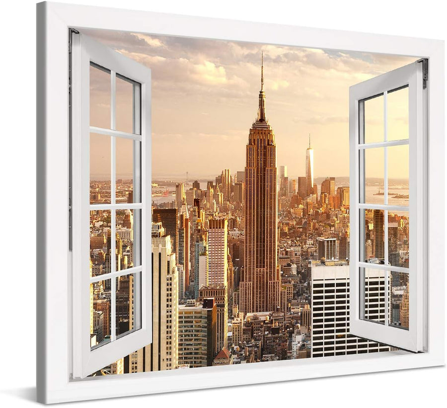 PICANOVA – Bild auf Leinwand Manhattan Empire State Building Fenster 100x75cm – Leinwandbild – Premi