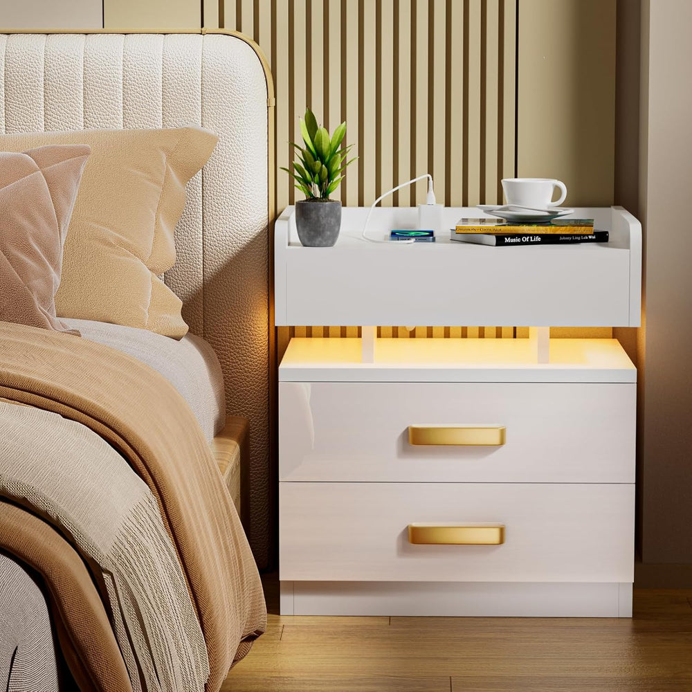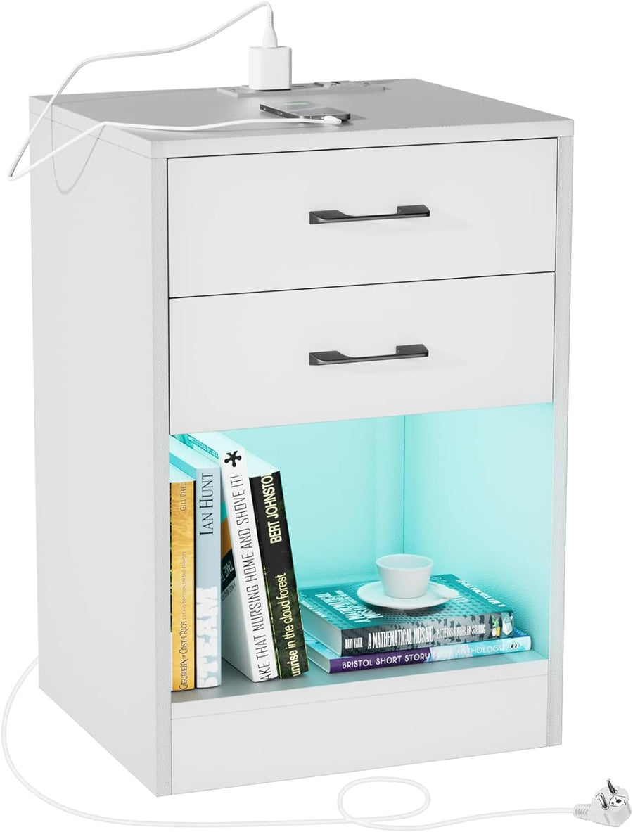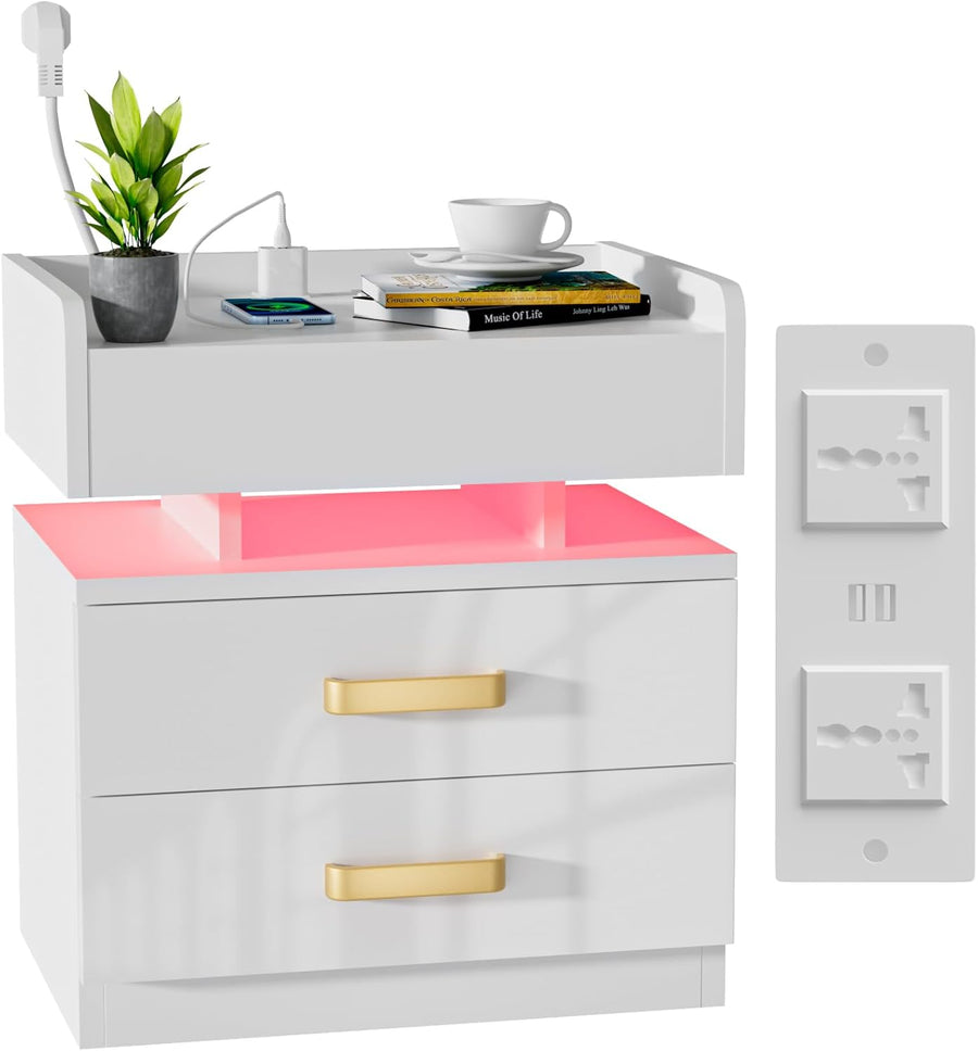 PIPIPOXER 2er Set Nachttisch mit Steckdose & USB, Nachttisch Weiss Nachtschrank Hochglanz Nachtkommo