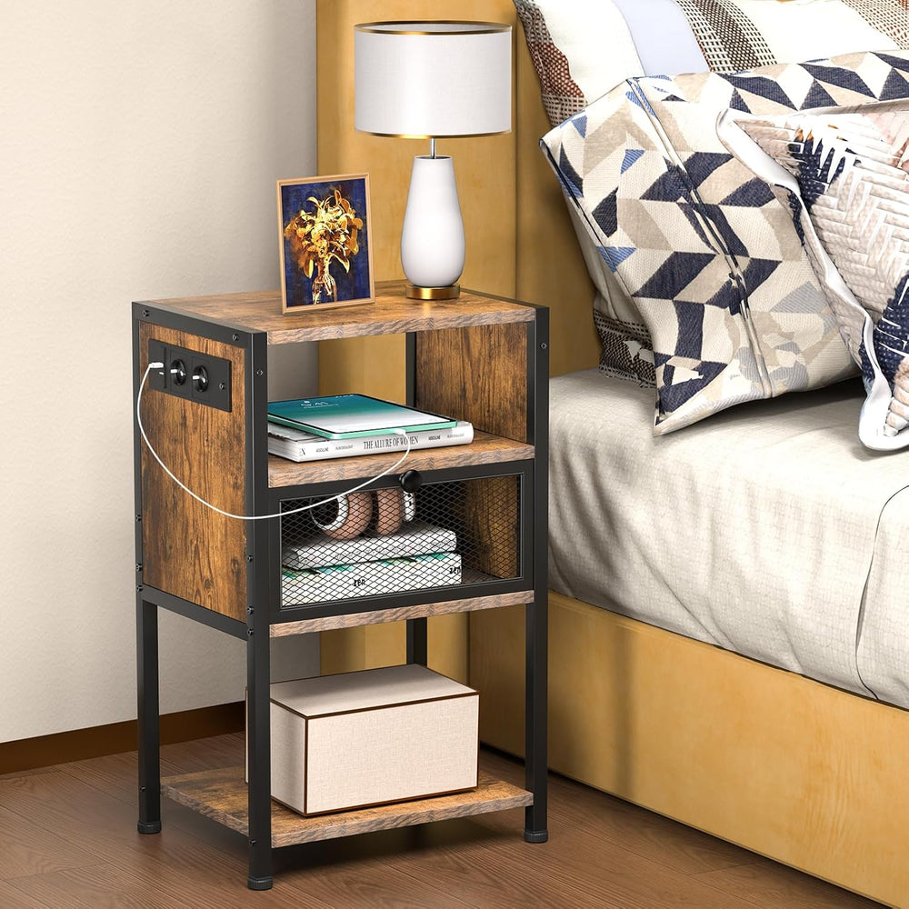 PIPIPOXER Nachttisch mit Steckdose, Nachttisch mit USB Anschlüssen und Steckdosen, Flip Top Beistell