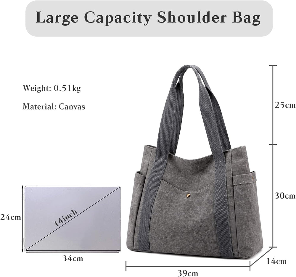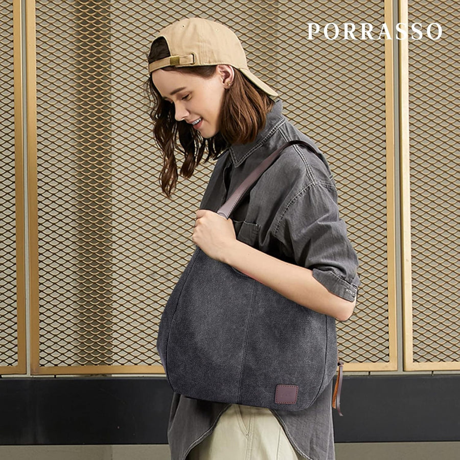 PORRASSO Damen Handtasche Canvas Schultertasche Gross Hobo Shopper Henkeltasche für Einkaufen Schule