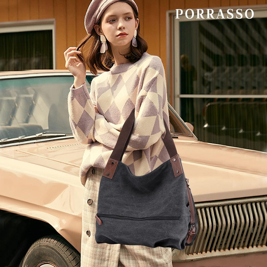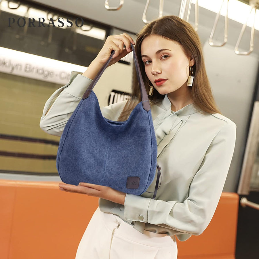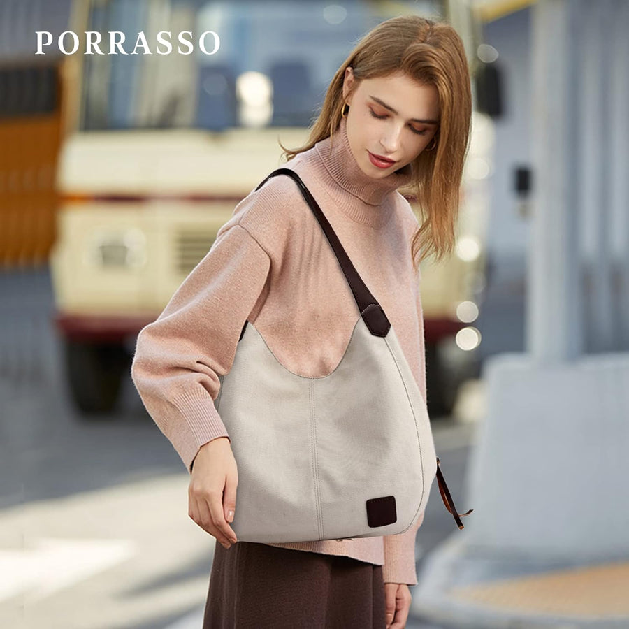 PORRASSO Damen Handtasche Casual Schultertasche Segeltuch Umhängetasche Frauen Hobotasche Crossbody