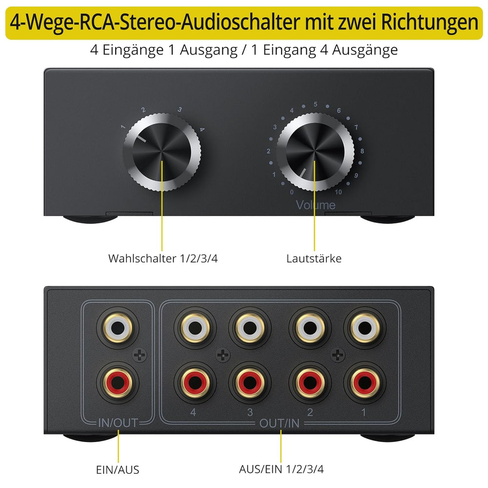 PROZOR Stereo Audio Schalter Cinch 4(1)-In-1(4)-Out RCA L/R Bidirektionaler Umschalter Stereo Audio