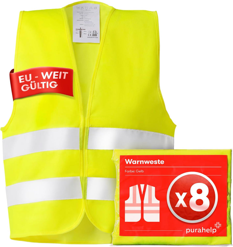 PURAHELP Warnwesten Auto 8er Set Europaweit gültig nach EN ISO 20471 - Reflektierende Warnweste Auto