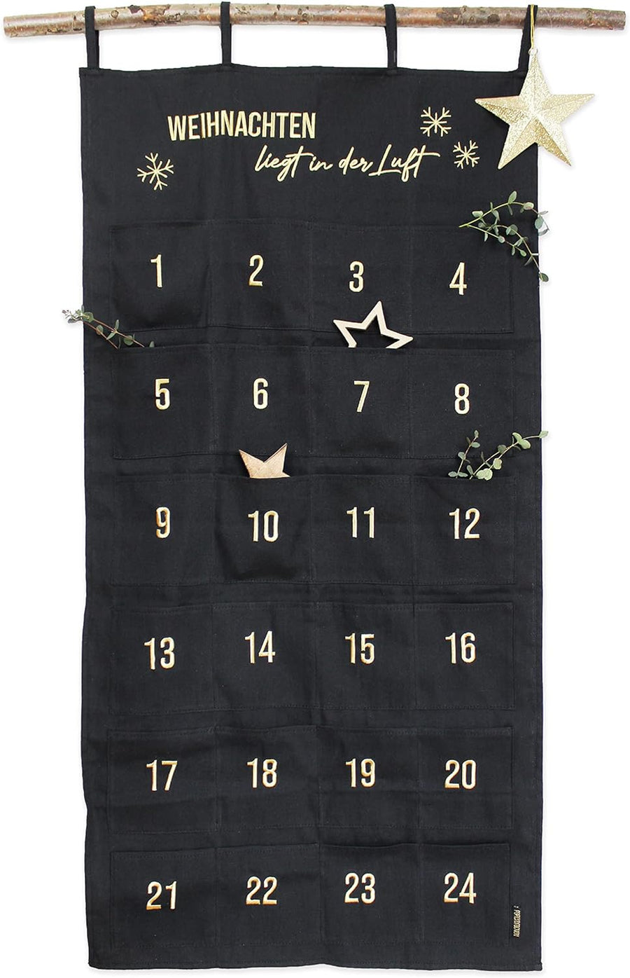 Papierdrachen Adventskalender 2023 als Wandkalender aus Stoff zum Befüllen - schwarz & gold - hochwe