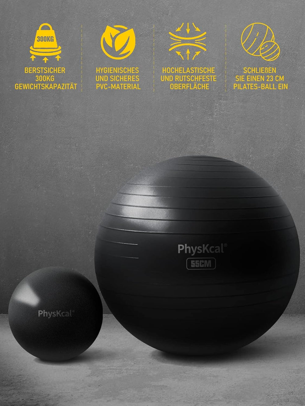 PhysKcal Gymnastikball in 55cm bis 85cm und 23 cm Pilatesball Set inkl. Luft-Pumpe | Berstschutz Gym