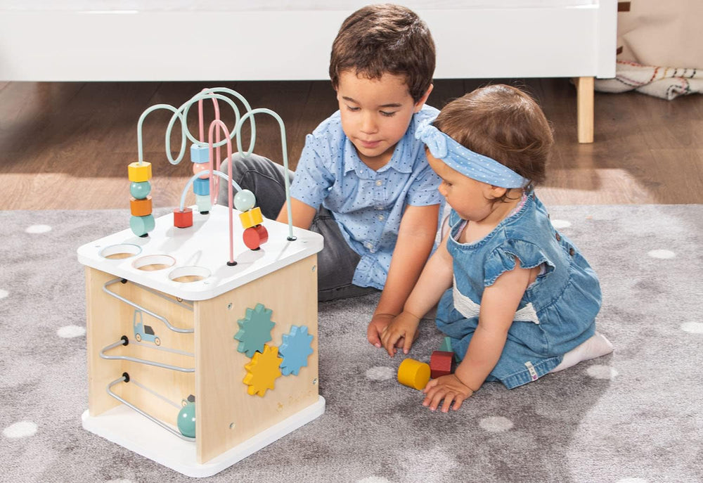 PINOLINO Motorikwürfel Sanna, aus Holz, 10 -tlg. mit 3 Kugeln, 6 Steckklötzen, Motorikschleife, bunt