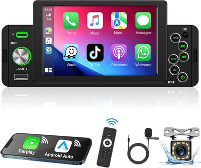 Podofo Autoradio 1 Din mit Apple Carplay Bluetooth 5.1 Android Auto, 5 Zoll Auto Radio Stereo mit Bi