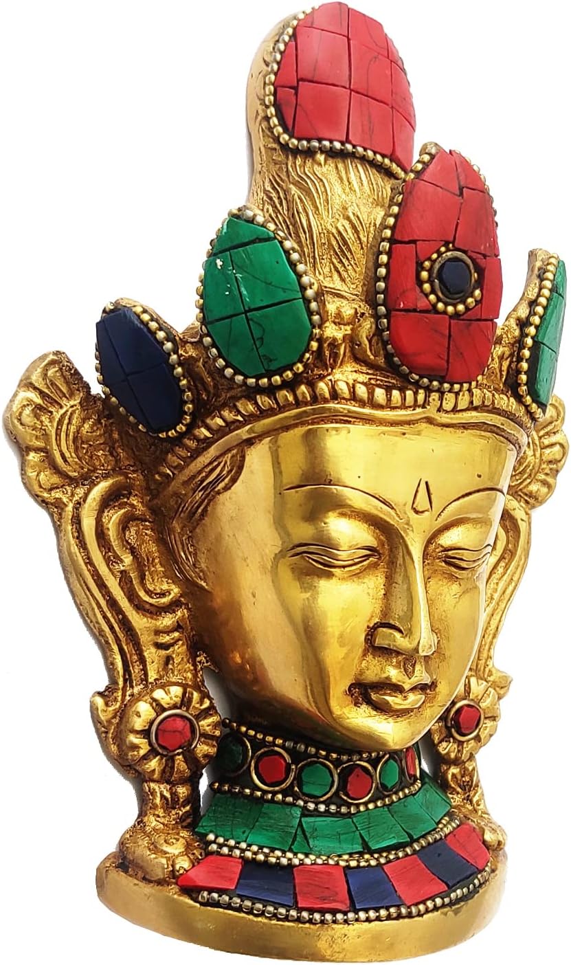 Purpledip Buddhist Goddess Tara Mask (Wall Hanging), Pure Brass with gemstone work (10649)