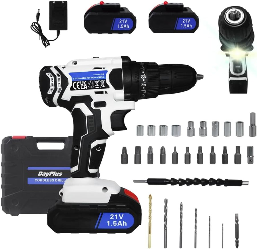 21V Akkuschrauber Akku Bohrschrauber Set Akku-Schlagbohrschrauber Akkubohrer mit 1500mAh Akkus, 45Nm
