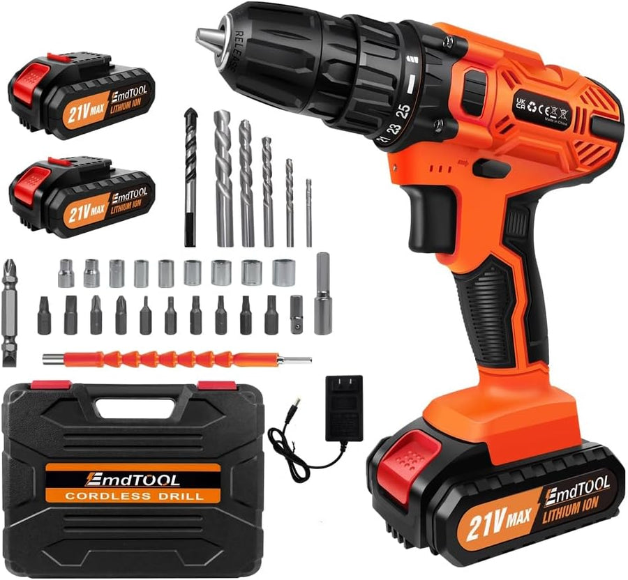 Akku-Bohrmaschine,21V Akku Bohrschrauber mit 2 Li-Ion Batterien,26 Stück Bohrkit enthalten, 25+1 Dre
