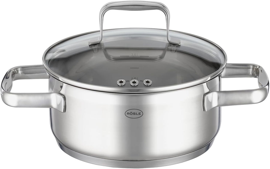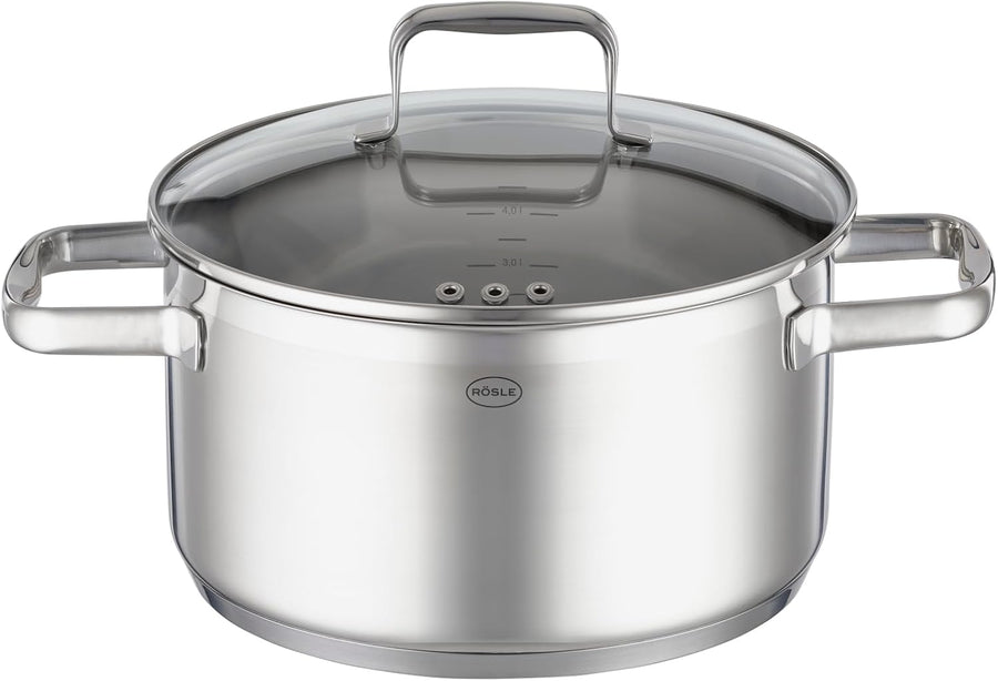 RÖSLE CHARM Kochtopf, Hochwertiger Universaltopf aus Edelstahl 18/10, 24 cm, Glasdeckel, Innenskalie