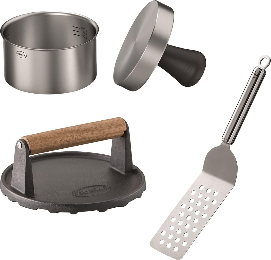 RÖSLE Barbecue Burger-Set 3-tlg, Hochwertiges Burger-Set mit Burgerpresse Pro, Barbecue-Gewicht und