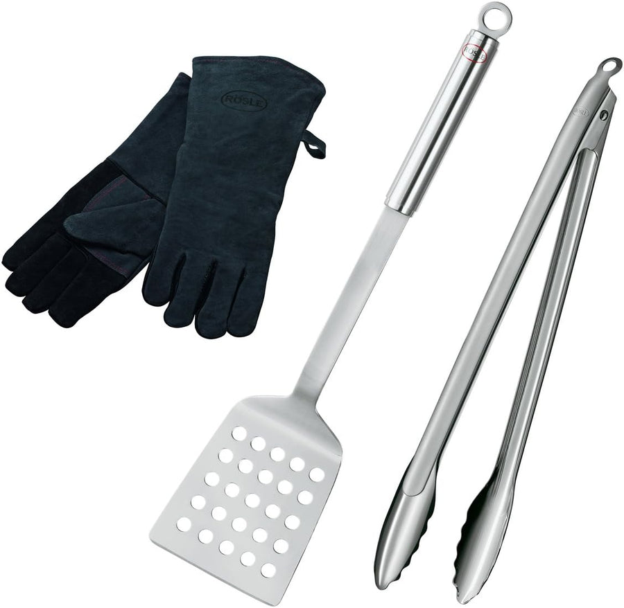 RÖSLE Barbecue-Set 3-tlg., Hochwertiges Grillset mit Leder-Grillhandschuhe, BBQ-Wender, Grillzange 4