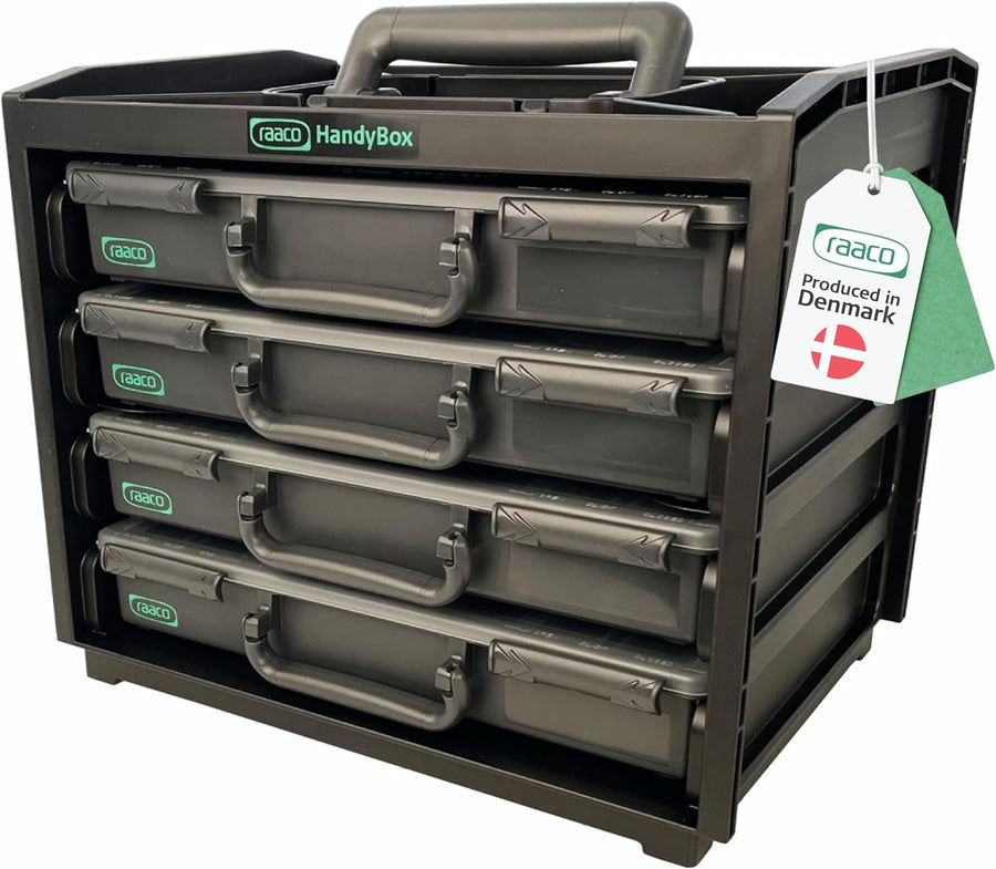 raaco HandyBox 55x4, Premium Sortimentskasten für Werkstatt, Tragerahmen mit 4 Sortierkasten für Kle