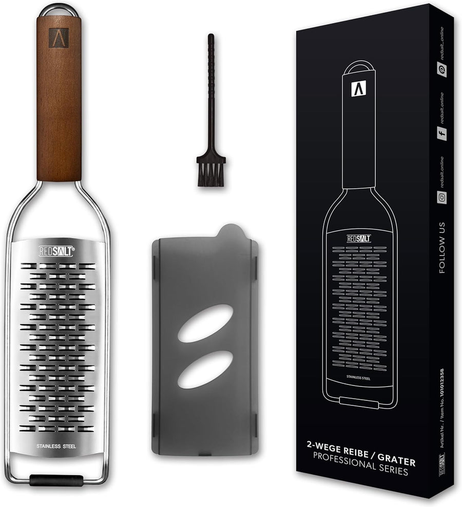 REDSALT® Premium 2-Wege Reibe mit Holzgriff | rasiermesserscharfe Profi Edelstahl Reibe für feine Ge