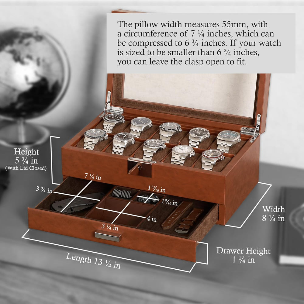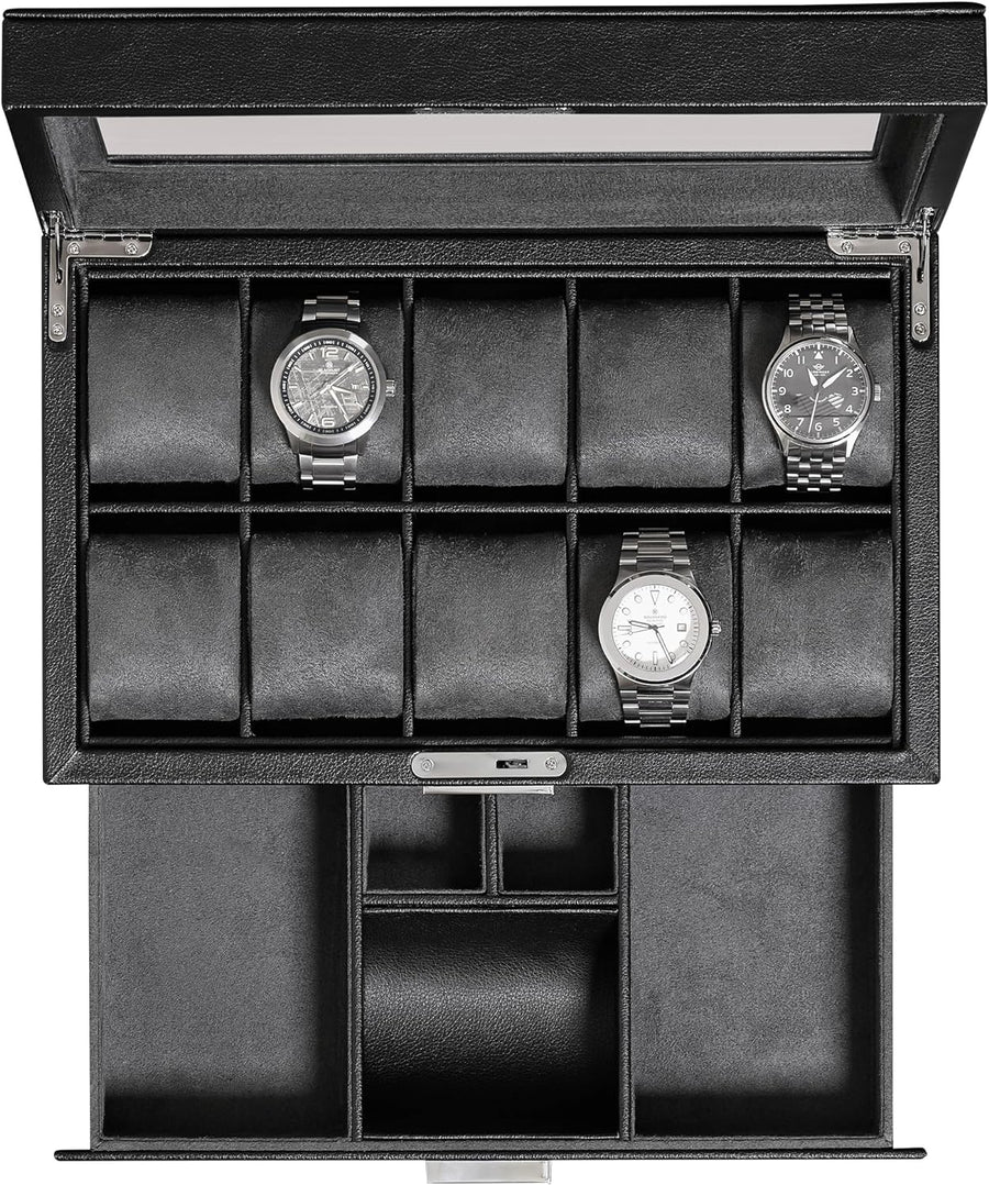 ROTHWELL Leder-Uhrenbox 10 Fächer mit Schublade, Luxus-Uhrenetui mit weichen Kissen, abschliessbarer