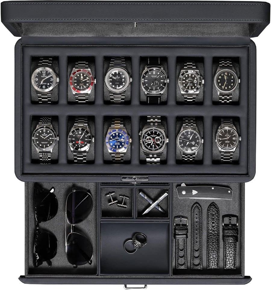 ROTHWELL 12-Fach-Leder-Uhrenbox mit Valet-Schublade – 12-Fach-Luxus-Uhrenetui, Display-Organizer, Mi