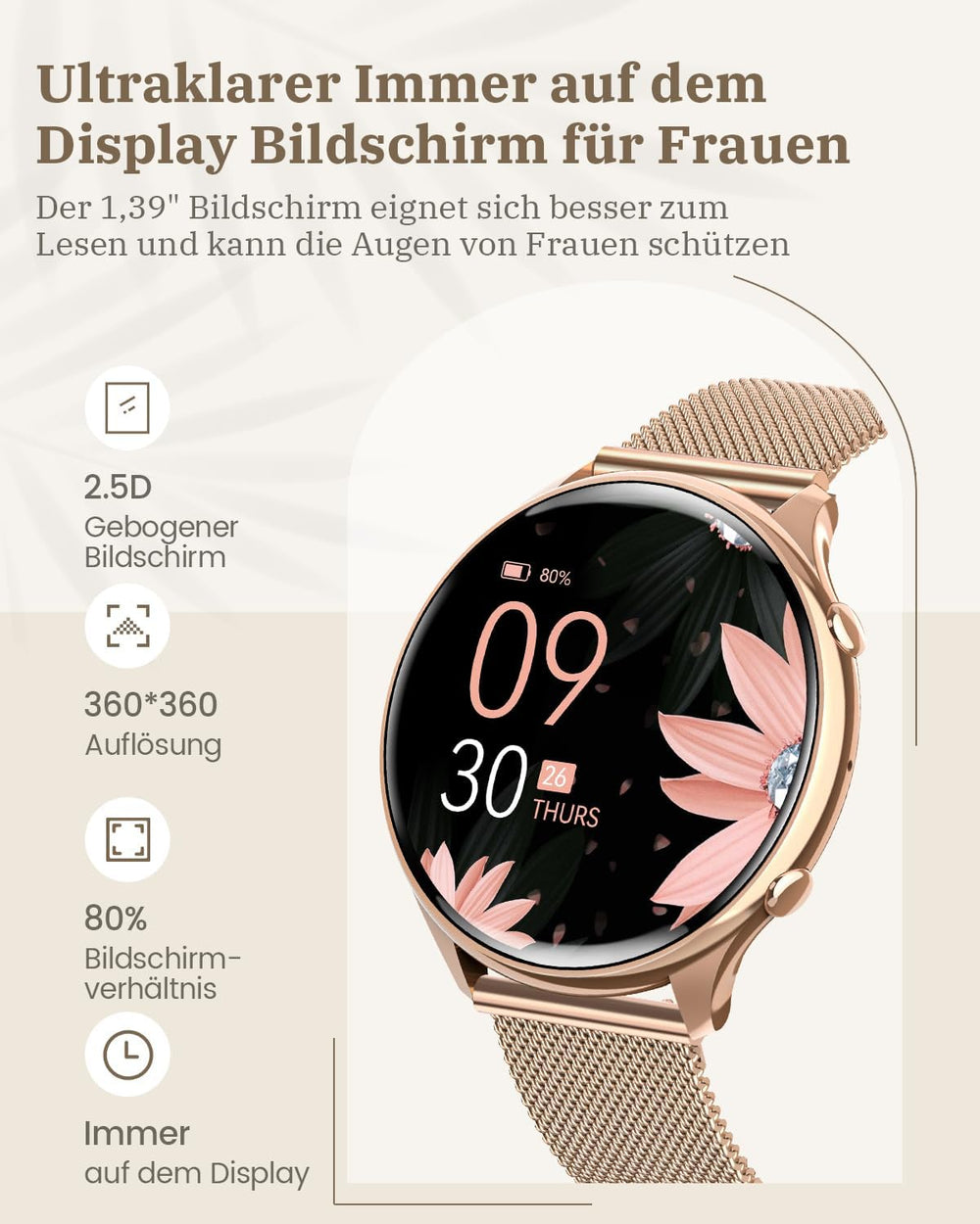RUXINGX Smartwatch Damen mit Telefonfunktion, 1,32 Zoll HD Voll Touchscreen, IP68 Fitness Tracker mi