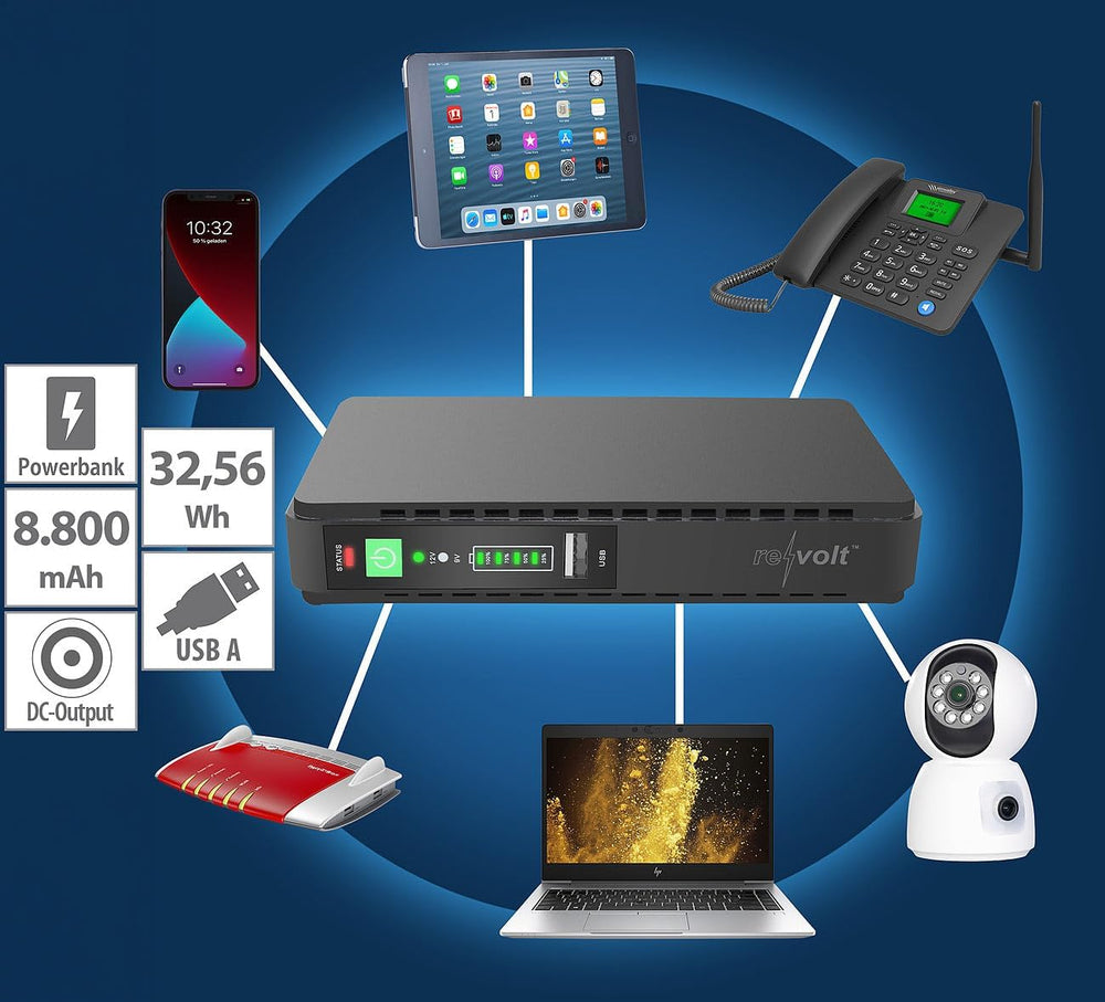 revolt 12V USV: Mini-USV, unterbrechungsfreie DC-Stromversorgung, 12 V, 22 W, 2000 mAh (Notstromvers