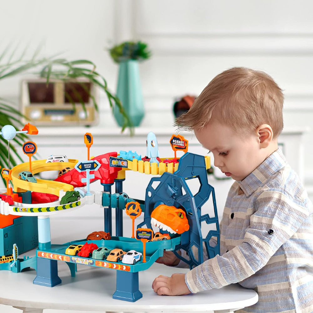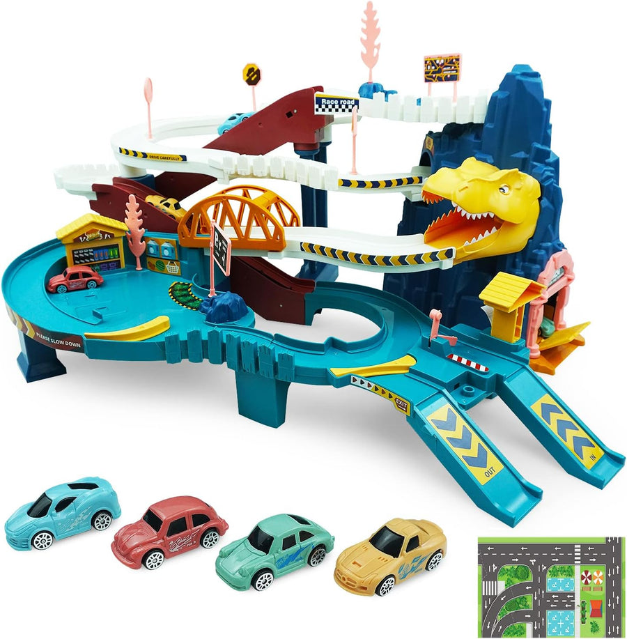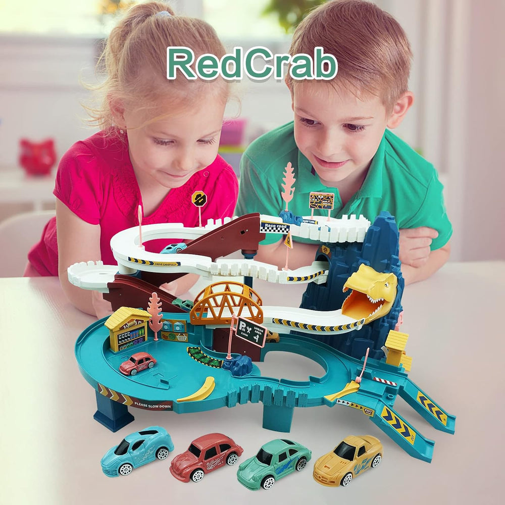 RedCrab Dinosaurier Spielzeug Autorennbahn für Kinder, Dino Autobahn mit 4 Spielzeugautos und Schien